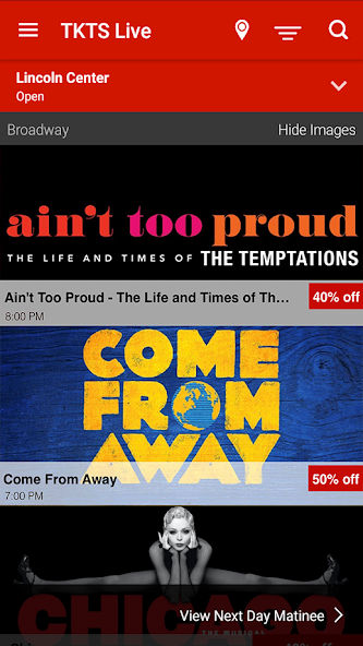 tkts ofrece boletos el mismo día para los espectáculos de Broadway y Off Broadway con descuentos de hasta un 50% de descuento en el precio completo. La aplicación oficial tkts está directamente vinculada a los tableros de pantallas en las cabinas de descuento tkts , por lo que lo que está viendo es exactamente lo que las personas que esperan en la fila están viendo. Las listados se actualizan en tiempo real para que tenga una lista completamente actualizada de los programas disponibles en la palma de su mano.